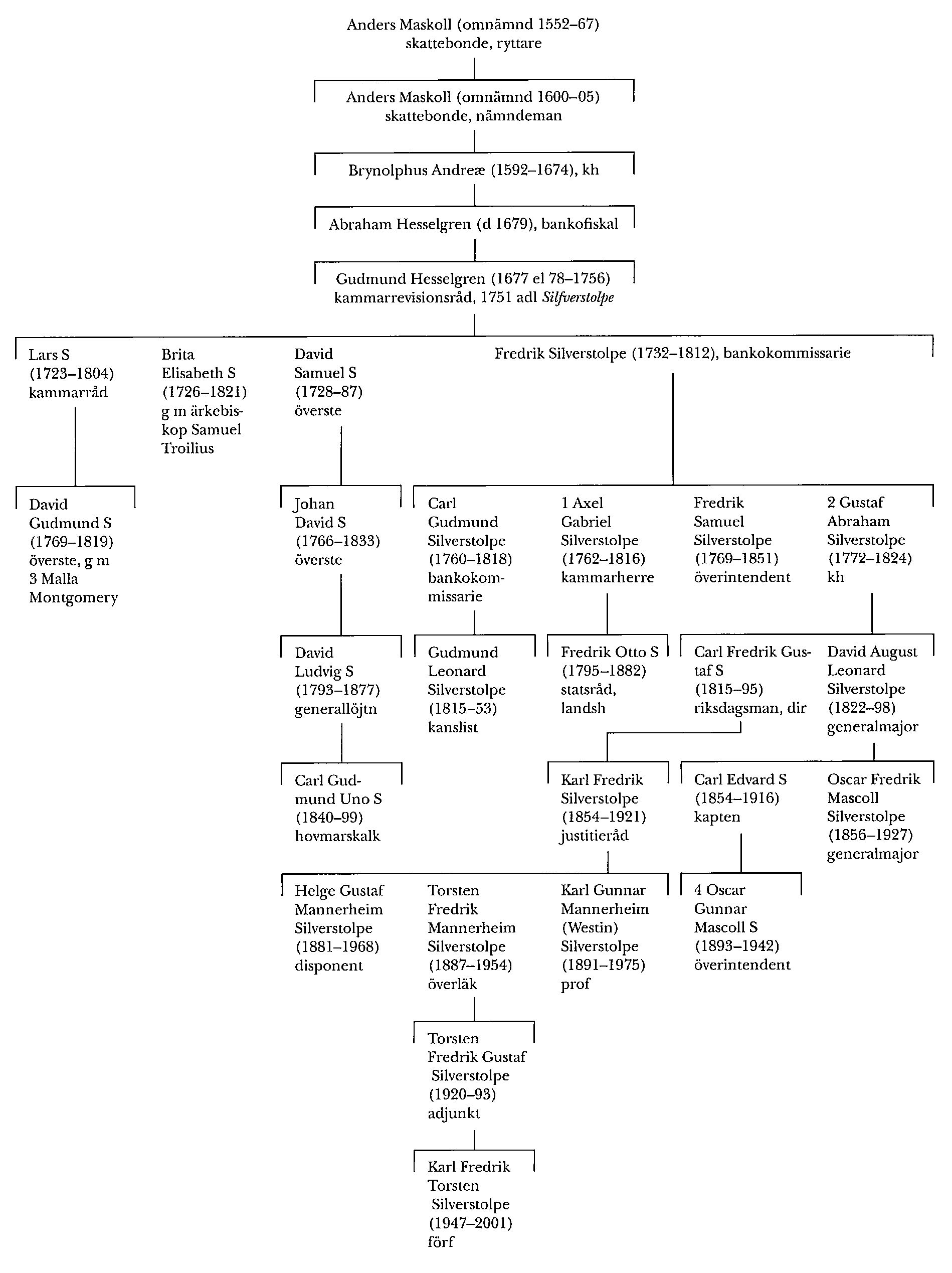 En sonson till Anders Maskoll var kyrkoherden i Edsleskog (Hesselskog), Dalsland, Brynolphus Andreæ (d 1674), vars barn efter hemorten antog namnet Hesselgren (bd 18). Sonen bankfiskalen Abraham Hesselgren (1640–79) var den förste av i flera generationer till Riksens ständers bank knutna släktmedlemmar. I sitt äktenskap med Sara Caméen, dotter till superintendenten Sveno Camœnius (bd 7), var han far till kammarrevisionsrådet Gudmund Hesselgren (1677 eller 1678–1756; bd 18, s 748) som 1751 adlades med namnet Silfverstolpe.