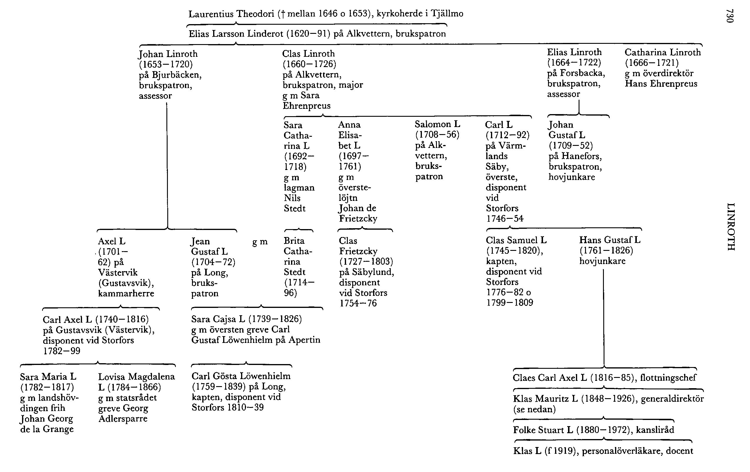 Källor o litt: Allmänt: G L v Schantz' genealogier, RHA; G Ekman, Ur Storforsverkens hist (1921); O F Strokirk, Kultur- o personhist ant.ar [1] (1915). Laurentius Theodori: RR 1637 juli-dec, f 674, E 776, RA; Linköpings domkapitels arkiv A I a:2 o 6, VLA; Linköpings hm, 2 (1846), s 244 f, 3 (1919), s 767; Strängnäs hm, 4 (1901), s 577. Elias Larsson Linderot: RR 1679 febr, f 579v-580, Adelsbrev, vol 11, Biographica, Genealogica, vol 109, Revisionsakt 30 dec 1673, Bergskolhs arkiv A I: 15, 17-21, 25-31, 33-37, B I: 29, 30, 32, 33, 36, 37,39, 41, 42, 49, 51, 52, 55, E IV: 54, 58, 60-63, 66, 68, 72, 76, 79, 81-83, 85, 90, 91, 93, 95, 96, 98, 99, E VI: 4-5, Harmens' register, Kammarkolks kanslis arkiv B II a 1): 19, maskinfel 27v, Kammarkolks länsko-pieböcker: Örebro län, vol 1, p 241 ff, J A Almquists lappkatalog över landsstatstjänstemän efter 1630: F 140, Reduktionskolhs arkiv F I: 45, f 125 f, 136v, Svea hovrätts arkiv E VI a 2 aa: 174: 13, 218: 18 o 266: 13, RA; brev 17 sept 1663 (om hans hustrus härstamning) i arkivet på Frötuna, Fel-lingsbro (xeroxkop i RA); Bergskoll; L Brodin, Bjurtjärn (1943), s 11, 17, 19, 27, 48, 54 f, 88; L Dalgren, Karlskoga hist 1586-1936 (1936); A Edestam, Dalsländska järnbruk, 6 (Dalia 15, 1948), s 4 f, 55 f; E Fernow, Beskrivning över Värmland, 1 (1977), s 382; J Furuskog, Asphyttan, Värmlands äldsta järnbruk (Värmland förr o nu 1921), s 39-43; A Garfvé o E Odhner, Fellingsbro sockens hist (3 uppl, 1958), s 272, 274; S Hegardt, Alkvettern (1946); E Herlenius, Porträtten på Storfors bruk (Värmland förr o nu 1921); F Högberg, Hook (Medd:n från Jönk.s hembygdsförbund, 36, 1963), s 70; J Johansson, Noraskogs arkiv, 2 (1893-95), s 606; N G Kjellin (prses C F Georgii), Dissertatio historica de regione metallica Carl-skoga (1779), s 14, 17, 22; J A A Ludeke, Denkmal der Wieder-Eröffnung der Deutschen Kirche in Stockholm ... (1823); A E Löf o A Ernvik, Kristinehamns hist, 3 (1959), s 180; G A Lögdberg, Några blad ur Lungsunds församlings hist (1943), s 13, 23; S A Nordenmark, Till Frötuna gårds minnen (Nerikes Allehanda 23 nov 1927); C E Nygren, Ett aktstycke om frälsegravar i Karlstads stift 1756 (Värmland förr o nu 1927), s 111; A G Petersson, Alkvetterns säteri i Bjurkärn (1930); G v Schoultz, Alkvettern (Slott o herresäten i Sverige. Västergötland. Dalsland. Värmland, 2, 1968); D Toijer, Gustafsvik (1958); J Wikberg, Götlunda från forntid till nutid (1950), s 196 f, 201. Elias L: H Almquist, Gbgs hist, 2 (1935); Edestam, a a, s 6, 9-12, 15, 19-23, 26, 34, 55 f, 58; N Hj Holmberg, Åmåls hist, 1 (1943). Johan Gustaf L: Edestam, a a, s 19, 23, 26, 34, 55 f, 58; Frälseg, 4:3 (1976); Högberg, aa, s 71, 77, 79 f; E Äkerhielm, Nydala kloster (Sv slott o herresäten vid 1900-talets början. Småland, 1909), s 49. Clas L: Generalmönsterrulla för Närkes o Värmlands reg 1695, KrA; Almquist, a a; Brodin, a a, s 7 f, 11 ff, 17, 55; A Ericsson, Lesjöfors ab 1867-1917 (1917), s 19 ff; Frälseg, 2:1-2 (1934-35); E Gren, Värmlands nation i Uppsala, 1 (1939-60), s 193; Hegardt, a a; Herle-nius, aa, s 21-24; Högberg, aa, s 70 ff, 80; C O Nordensvan, Värmlands reg:s (Närkes o Värmlands reg:s) hist, 2 (1904); Nygren, a a, s 111; Petersson, a a; S Rönnow, Wedevågs bruks hist (1944); Toijer, a a; S Överström, Bilder ur Kroppa sockens hist (1947), s 51. Jean Gustaf L: Biogra-: phica, RA; Edestam, a a, s 19, 34; Fernow, a a; Högberg, aa, s 71, 77; Long (Sv slott o herresäten vid 1900-talets början. Värmland, 1914); Lögd-berg, a a, s 22, 39; SjVerml; Toijer, a. a.; Å Wiberg, Apertin (1960), s 222, 237 f; E Äkerhielm, Sv gods o gårdar, 1 (2 uppl, 1930), s 567. Johan L: Almquist, a a; Edestam, a a, s 4-12, 15, 21 ff, 34, 55 f, 58; Fernow, a a, 2; Gren, a a, s 189; Herlenius, a a, s 22 f: Holmberg, a a; Högberg, a a, s 70 f, 81; Long (Sv slott o herresäten vid 1900-talets början. Värmland, 1914); Löf o Ernvik, aa, 2 (1949)-3; Lögd-berg, a a, s 23—26; Nygren, aa, s 113; G v Schoultz, Upperud (Slott o herresäten i Sverige. Västergötland. Dalsland. Värmland, 2,1968); Toijer, aa. Sara Cajsa L: F Alsterlind, Den gamla kyrkplatsen (1955); E Herlenius, Sant o sägen om "grevinnan på Apertin" (Värmland förr o nu 1920); Wiberg, a a, särsk s 237-40, 292-301, 403; Överström, a a, s 206. Axel L: Edestam, aa, s 8, 19, 34, 38, 55-58; Fernow, aa, 2; Högberg, aa, s 71, 77; SjVerml; Toijer, a a. Carl Axel L: M 1105, RA; Edestam, a a, s 35-38, 55; L Geijer, Släkten Geijer (1953); H Gillingstam, Den skånsk-norrländska släkten Sve-nonius (1966); Herlenius, a a 1921, s 25 f; Löf o Ernvik, a a, 1 (1942)-3; Nordensvan, a a; Toijer, a a. Salomon L: Biographica, RA; Brodin, a a, s 28, 55; Hegardt, aa; S Heijkenskjöld, En bergsmanssläkts hist (1933); Herlenius, a a 1921, s 23; Petersson, aa; D Tilas, Curriculum vitas (HH 38:1, 1966). Carl L: Fernow, aa, 2; Hegardt, aa; Heijkenskjöld, a a; F Högberg, a a, s 83; S Högberg, MLPS 1766-1815 (1961); Löf o Ernvik, aa, 2-3; Malmström; Nordensvan, a a; N Staf, Ransäters-bruken o deras ägare (1974); L Tham, Säby (Slott o herresäten i Sverige. Västergötland. Dalsland. Värmland, 2, 1968); Tilas, a a; Toijer, a a. Clas Samuel L: Nordensvan, a a.