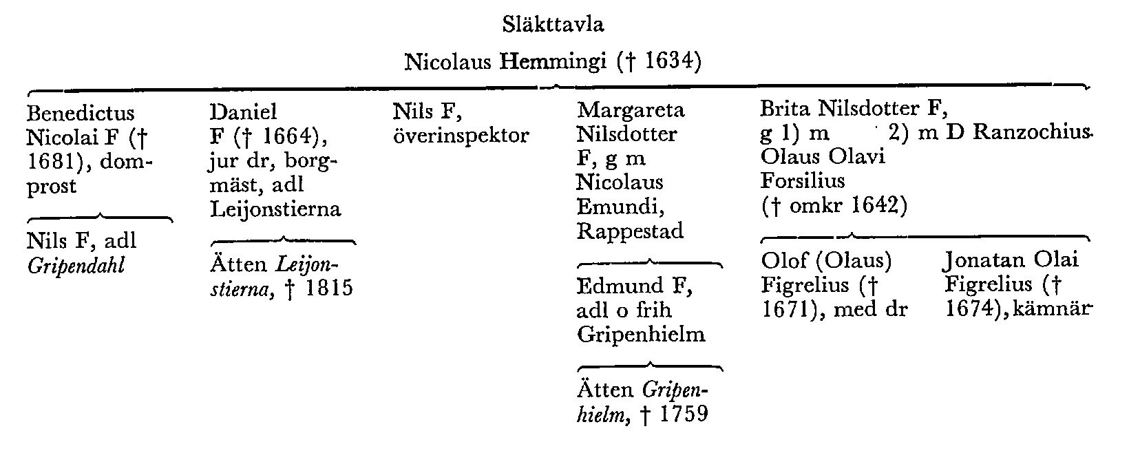 2 Domprosten Benedictus Nicolai F:s ena syster Margareta Nilsdotter Figrelia äktade kyrkoherden i Rappestad, kontraktsprosten Nicolaus Emundi (f omkr 1585, d 1653). Deras barn upptog efter moderns, släkt namnet Figrelius. Bland dem var Edmund F (1622–75), som 1660 adlades med namnet Gripenhielm och 1673 blev friherre. Han är känd som bl a Karl XI:s lärare, riksråd, chef för k biblioteket och boksamlare (hans bibliotek nu i LUB). Om honom och hans ätt se vidare under Gripenhielm [1].