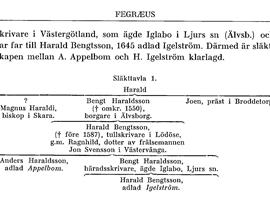 1. Historiografiskt sett återgår Stiernmans uppgift på vida äldre källor. Redan i sköldebrevet för friherrliga ätten Appelbom 1719 är myten fullt utbildad och »böljorna» där satta i hjärtvapnet, medan det adliga appelbomska äppleträdet försvunnit ur vapnet. I Peringskiölds genealogier (»Ätte book», Riddarhuset) finns genealogien ännu något tidigare och återgår utan tvivel i viss mån på uppgifter, som i sin ursprungliga, rätt magra form härröra från den 1645 adlade häradshövdingen Anders Haraldsson Appelbom (f. 1576, d. 1649). Medan inga som helst antydningar om frälsehärstamning finnas i sköldebreven för ätterna Strömfelt (1632, konfirmationsbrev 1634), Appelbom och Igelström (båda 1645) eller Fägerstierna (1675), har A. Appelbom efterlämnat vissa biografisk-genealogiska anteckningar, som i senare avskrift (från 1600-talets slut?) finnas i Krigsarkivet (Biographica). Han anger där, att hans fader var Harald Bengtsson, född i Nylöse (Nya Lödöse), »stadsens sekreterare» där, att dennes far Bengt Haraldsson, också född i Nylöse, var »biskop Månses i Skara broder» och att deras far var »Harald Månsson af Stoor Wånga». Möderneuppgifterna i nämnda avskrift äro, såsom J. Liedgren utrett, endast rätta däri, att modern hette Ragnhild och tillhörde en släktkrets från Västervånga (i Norra Vånga sn, Skånings härad), eljest felaktiga, men härröra måhända från en senare hemulsman. Troligare är, att biskop O. Laurelius' notiser i likpredikan över Anders Appelbom (1650) återgå på denne eller hans egen familj, och där kallas modern Ragnhild Svensdotter, dotter av Sven Jonsson i Västervånga, en adelsman. Liedgren har visat, att hon i själva verket hette Ragnhild Jonsdotter, var syster till Sven Jonsson och dotter av Jon Svensson i Västervånga, en frälseman, som deltog i Västerås riksdag 1527 och är stamfar för ätten Lind af Hageby. Då Anders Appelbom sålunda icke ens fullt korrekt vetat namnet på sin morfar, böra hans uppgifter även i övrigt granskas med stark kritik. Notisen att farfadern varit bror till biskop Magnus Haraldi i Skara kan ej kontrolleras, och biskopens släkt är okänd; möjligen är uppgiften riktig. Att Appelboms farfars far varit »Harald Månsson af Stoor Wånga» skulle genom notisens formulering snarast antyda, att det här rört sig om en frälseman. Liedgren har emellertid visat, att Jon Svenssons i Västervånga dotter Ragnhild först var g. m. den ofrälse Nils Ingemarsson och sedan 1574 äktade tullskrivaren i Lödöse Harald Bengtsson – Appelboms far – vilken enligt frälserannsakning 1576 också var ofrälse. Härmed falla alla påståenden om, att familjen Appelboms fäderneförfäder skulle varit frälsemän. Notisen om farfarsfadern och hans gård är tydligen ren konstruktion, påverkad av den frälse mödernehärstamningen från Västervånga. Det visar sig även, att A. Appelboms farfar, på vilken han har rätt namn, kan identifieras genom inlagor i en arvsprocess mellan hans andra maka som änka och döttrarnas i första giftet båda män. Den ena inlagan (Sandbergska saml., YY 4335–4336, KA) är en skrivelse från borgmästare och råd i Älvsborg 24 aug. 1558 (adressat: Måns Jönsson). Den andra inlagan är ett odaterat brev (ibid., YY 4337; jfr även pergamentsbrev i Kammarkollegii arkiv 23 maj 1566), härrörande från Bengt Haraldssons mågar (borgare i Älvsborg); på dess baksida finns en stamtavla, trol. av Rasmus Ludvigsson. Av inlagorna framgår, att Bengt Haraldsson var borgare i Älvsborg, hade skeppsparter där och var bror till »herr Joen i Broddetorp», således en präst. Även dessa uppgifter visa således, att det här rör sig om en ofrälse familj. Tullskrivaren (fullmakt som sådan 5 sept. 1571, Riksregistr.) Harald Bengtsson dog tidigt (före 1587 enligt Liedgren, s. 43), och A. Appelbom (f. 1576) kan därför svårligen ha haft större tillgång till genealogisk kunskap genom honom. Fadern är troligen identisk med den Harald Bengtsson i Lödöse, som kallas salig redan 19 okt. 1586 i Nya Lödöse tänkeböcker (där f. ö. modern nämnes i samband med arvsprocessen efter hennes förste man, se Liedgren) – sonen Anders, den blivande A. Appelbom, var då blott 10 år. Att den sistnämnde hade en bror Bengt Haraldsson (f. 1579), säger han själv (KrA), och denne är tydligen den Bengt Haraldsson, häradsskrivare i Västergötland, som ägde Iglabo i Ljurs sn (Älvsb.) och var far till Harald Bengtsson, 1645 adlad Igelström. Därmed är släktskapen mellan A. Appelbom och H. Igelström klarlagd.