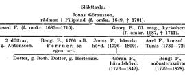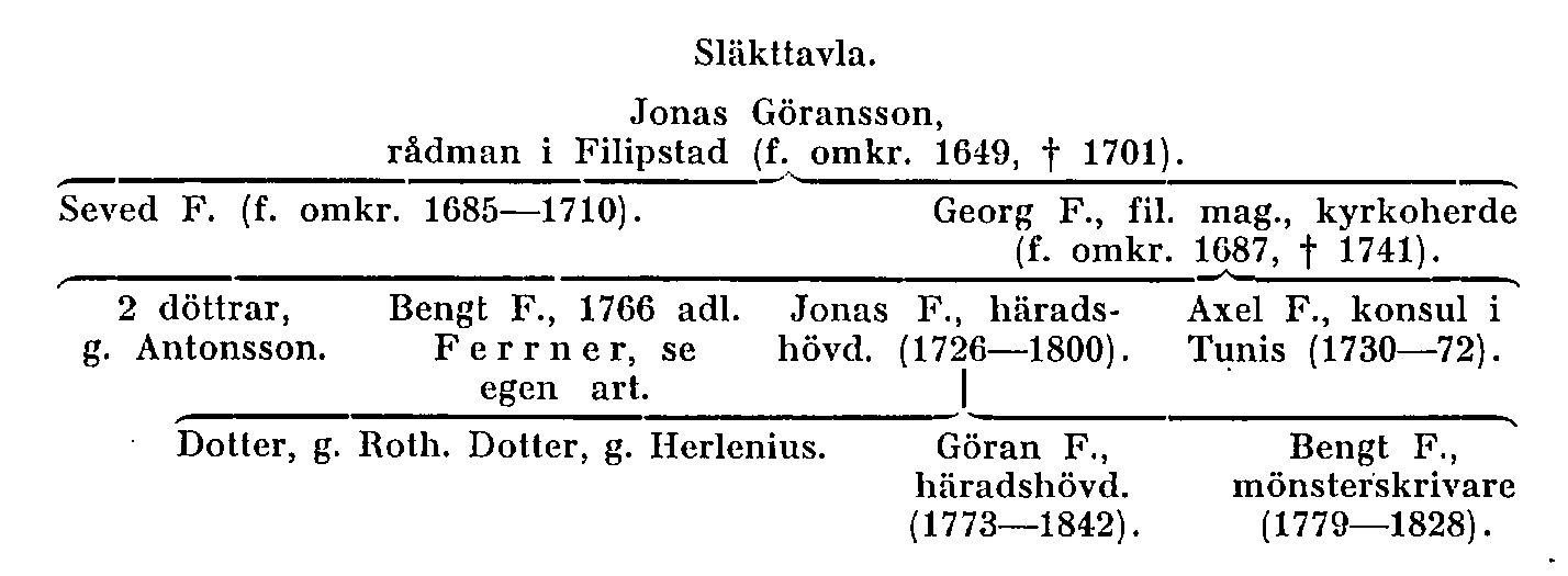 Bland Jonas F:s barn voro döttrarna Maria F. (f. 1775, d. 1841), g.m. bergsfogden David Ulric Roth (f. 1765, d. 1834), och Margaretha Elisabeth F. (Greta-Lisa; f. 1784, d. 1853), g. 1810 på Villingsberg m. fältsekreteraren Johan Henric Herlenius (f. 1780, d. 1867). Fru Herlenius anges ha varit »liten och ful som alla Fernrar». De voro föräldrar till brukspatron Jonas Herlenius på Storfors (om familjen se Herlenius, s. 59 f.). Utom en yngre son, mönsterskrivaren Bengt F. (f. 1779, d. 1828, ogift) hade Jonas F. och Maria Ullmark sonen Göran F. (f. 1773, d. 1842), vilken liksom fadern blev häradshövding i Östersysslet (1826–42, se J. E. Almquist, 1, s. 202). Han äktade sin kusin Anna Elisabeth (Anna-Lisa) von Hofsten (f. 1784, d. 1842; tidigare gift Risellschöld, men skild), dotter av brukspatron Erland von Hofsten och Anna Lisa Ullmark. Bland Göran F:s och Anna-Lisa von Hofstens barn blev dottern Stina F. (f. 1822, d. 1907) 1854 g. m. brukspatronen på Brunsberg, Brunskogs sn (Värml.) Lars Johan Kolthoff (f. 1821, d. 1890). Göran F:s kusingifte slog illa ut för sönernas del. De fem, som nådde mogen ålder, blevo alla indolenta, obetydliga och mer eller mindre livsodugliga, trots att en av dem, Henrik F. (f. 1818, d. 1886), nådde magistergraden. Den, som officiellt slöt släkten på manssidan, hette Göran F. (f. 1816, d. 1893). Emellertid efterlämnade hans bröder lantbrukaren Jonas F. (f. 1812, d. 1850) och mönsterskrivaren Bengt F. (f. 1824, d. 1886) var sin utomäktenskaplig son och dessa upptogo namnet, varför släkten på så vis fortlever.