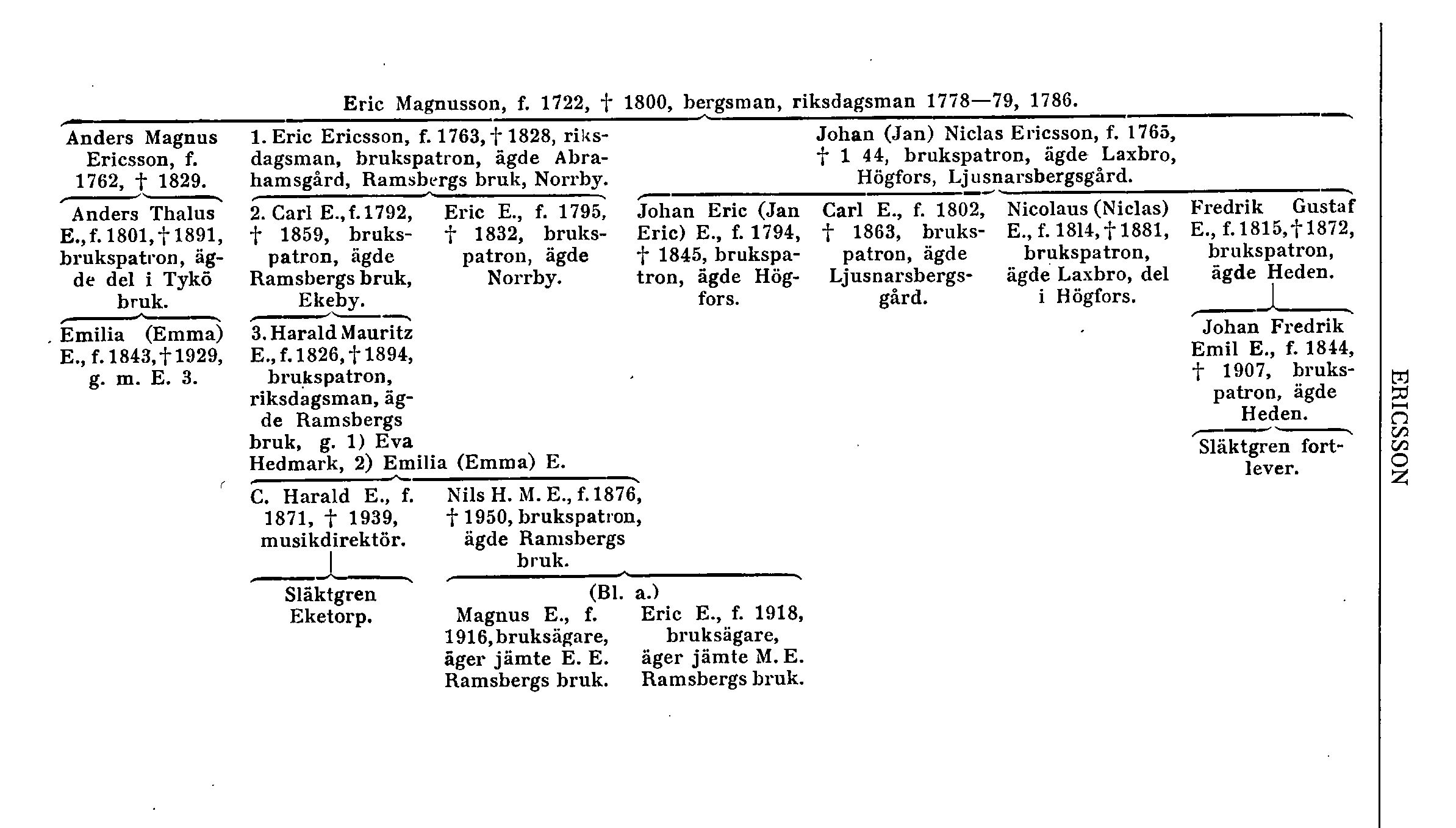Släktens tredje linje, Laxbro-Högforsgrenen, härstammar från Eric Magnussons yngste son och Eric E. d. ä:s bror, brukspatron Johan (Jan) Niclas E. (f. 1765, d. 1844). Han var bergssexman och bergsgevaldiger, övertog faderns Laxbro samt inköpte vid 1800-talets början Högfors' bruk och egendom, också i Ljusnarsberg; i orten gick han under namnet »Laxbrogubben». Han anlade där 1840 en stångjärnssmedja med franche-comté-härd (smidet nedlades i slutet av 1800-talet). Högfors övertogs först av hans äldste son brukspatron Johan Eric (Jan Eric) E. (f. 1794, d. 1845); denne, som »icke var av särdeles medgörligt slag» (Harald M. E:s memoarer), dog ogift året efter fadern. Jan Eric E:s bror brukspatron Carl E. (f. 1802, d. 1863) övertog den av fadern 1805 inköpta Ljusnarsbergsgård; han var gift två gånger, med två systrar öhman av den här förut nämnda släkten, men hade ej egna barn. En tredje bror, brukspatron Nicolaus (Niclas) E. (f. 1814, d. 1881), övertog Laxbro och ägde även del i Högfors. Sistnämnda bruk försåldes emellertid 1872 till Högfors aktiebolag. Brukspatron Niclas E:s systerson H. J. N. Westholm (f 1921), som var ungkarl, fick Laxbro. Det var han som skänkte Laxbrostugan (jfr ovan s. 168) till Skansen, dit den flyttades 1895. En fjärde bror, Fredrik Gustaf E. (f. 1815, d. 1872), var vice kommissionslantmätare och brukspatron samt ägde Heden, Ljusnarsbergs sn (Ör.), vilken gård sedan tillhörde hans son brukspatron Johan Fredrik Emil E. (f. 1844, d. 1907). Dennes släktgren fortlever; en genealogisk utredning därav är gjord av brukspatron Emil E:s sonson filaren Axel E., Eskilstuna (maskinskrivet ex. hos kanslisekreteraren Bertil Eketorp, Stockholm).