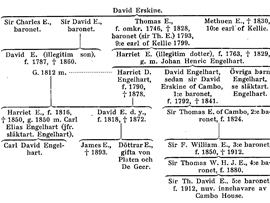 Efter den yngre pretendenten Karl Edvards nederlag vid Culloden 1746 gingo godsindragningar ut över hans anhängare, däribland medlemmar av ätten E. Sålunda indrogs av den jord, som medföljde värdigheten som earl of Kellie, allt utom slottsruinen med några få acres betesmarker (jfr nedan). Bland dem, som efter Cullodenkatastrofen och godsindragningarna emigrerade från Skottland, var Thomas E. (d. 1828), som 1759 tog affärsplats i Göteborg och arbetade sig fram till ställningen som en av stadens förnämligare grosshandlare samt brittisk konsul; om honom se särskild art. nedan. Hans äldre bror kapten David E. (d. 1793) och hans yngre bror Methuen E. (d. 1830) voro vid 1770-talets mitt bosatta som affärsmän i Bengalen i Indien (jfr nedan s. 482), varifrån dock Methuen E., i varje fall för en tid, återvände till sitt hemland 1779. Efter äldste brodern sir Charles E. (se släkttavlan) gick värdigheten som baronet till David, nu sir David E., och vid hans död 1793 till Thomas, som sådan sir Thomas Erskine. Denne återvände 1799 från Sverige till Skottland, s. å. han genom arv från en äldre linje fått värdigheten som 9:e earl of Kellie, dock utan det gods, som tidigare åtföljt titeln (jfr ovan). I stället hade han redan omkring 1790 inköpt ett annat, gammalt familjegods, Cambo House i Fifeshire, Skottland, vilket blev hans hem. Hans äktenskap med Anne Gordon var barnlöst. Lord Kellie hade emellertid före sitt äktenskap en illegitim dotter, Harriet E. (f. 1763, d. 1829), som 1787 äktade Johan Henric Engelhart (se denne), senare medicine professor i Lund och prost i Fellingsbro. Av deras nio till mogen ålder komna barn uppfostrades, hos morfadern i Skottland dels tre döttrar (Anna, Harriet och Caroline Engelhart), dels äldste sonen, David Engelhart. Lord Kellie adopterade denne dotterson och gjorde honom till sin universalarvinge. Lordens titlar kunde däremot ej ärvas genom den illegitima, dottern, professorskan Engelhart, utan värdigheten som earl of Kellie gick först till Thomas E:s yngre bror, Methuen E. (t barnlös. 1830) och efter denne till en avlägsen, här ovan nämnd släktgren. Lord Kellie lyckades emellertid utverka ett engelskt k. brev av 27 aug. 1821, som förlänade en ny, till Cambo House knuten baronetvärdighet åt hans dotter- och adoptivson. Härigenom förvandlades, professorssonen David Engelhart från Lund till sir David Erskine of Cambo (f. 1792, d. 1841), baronet, i Skottland. I sitt gifte (1821) med en förmögen prästdotter från Wales, Jane Silence-Williams (d. 1880), hade denne bl. a. tre gifta söner: överstelöjtnanten sir Thomas E., andre baronet (f. 1824), brittiske konsuln, på Madeira David Holland E. samt Hugh Henry E. Det gamla magnifika Cambo House brann 1879; slottet återuppbyggdes men icke i sin gamla stil. Son till sistnämnde sir Thomas samt tredje: baronet var översten sir Ffolliott William E. (f. 1850, d. 1912). Dennes äldste son, överstelöjtnanten sir Thomas Wilfred Hargreaves John E. (f. 1880), fjärde baronet, var fader till den nuvarande innehavaren av Cambo House, femte baronet sir Thomas David E. (f. 1912); rörande övriga grenar av släkten Engelhart än denna skotska Erskine-gren, se släktart. Engelhart.