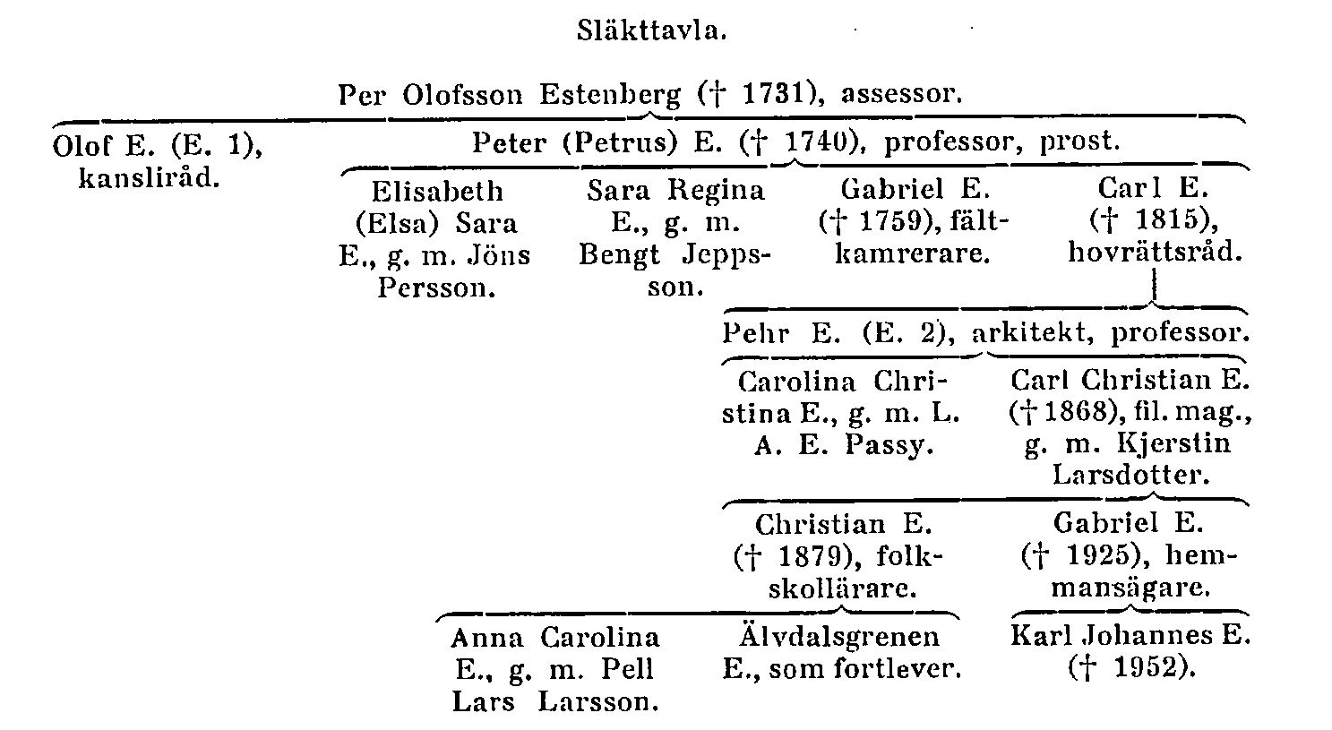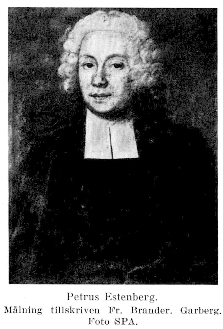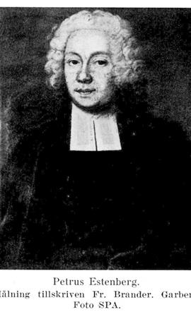 Peter (Petrus) E. (f. 1686, d. 1740) blev student i Uppsala 1699, överflyttade 1710 till Lund och blev sept. 1716 filosofie adjunkt vid Lunds universitet. Han utsågs juni 1717 till guvernör för pfalzgrevinnan Katarinas son greve Carl Adolf Gyllenstierna, med vilken han reste utrikes. Intresserad också för svensk historia gjorde P. E. arkivstudier under resan i Holland, Frankrike och Tyskland. Han utnämndes 30 okt. 1718 till sekreterare hos konung Stanislaw Leszczynski, som då vistades i Zweibrücken, och sändes av denne i mars 1719 hem för att lyckönska drottning Ulrika Eleonora till tron-bestigningen, ehuru det blev till Fredrik I, som han fick framföra lyckönskningen. I okt. 1719 utnämndes P. E. till professor i grekiska vid Lunds universitet. Hans imponerande bokförteckning (bifogad bouppteckningen i Göta hovrätts arkiv) vittnar om hans stora lärdom och omfattade i synnerhet en betydande samling av grekiska klassiker; delar av detta bibliotek voro ännu 1920 kvar hos släkten E:s dalagren (se nedan; närmare hos Herlenius i Personhist. tidskr. 1920, s. 155). P. E. beslöt sig emellertid av ekonomiska skäl att överge akademien (ett steg, som ogillades av fadern och brodern Olof) samt sökte och erhöll Jämshögs pastorat 1727, prästvigdes våren 1728, flyttade dit och blev senare även prost. År 1722 hade han äktat Regina Westersköld, med vilken han fick nio barn, av vilka de fem yngsta föddes i Jämshög. För socknen blev professorsparets ditflyttande en stor händelse med följder till nutiden. Socknen var fattig, och P. E. lät, delvis på egen bekostnad, utvidga och försköna dess kyrka, så att, som det skrevs 1741, det icke fanns en »mera lysande och mindre kostsam lantkyrka» i hela Blekinge. Han befordrade socknens både andliga och materiella väl, var en nitisk förkämpe för hyfsning och goda seder, allvar och gudsfruktan (Kronsjö). Mot de såsom ett »hårdsint folk» kända blekingarna i Jämshög visade han klokhet och kraft. Hans själavård och kyrkotukt fingo tydliga resultat. Att han i särskild grad blev ihågkommen i socknen berodde på speciella förhållanden. Det blev nämligen stor uppståndelse i familjen, då dottern Elisabeth (Elsa) S ar a E. (f. 1723, d. 1762) blev förälskad i en »bonddräng» i Jämshög, Jöns Persson, senare rusthållare i Vånga. Professorn och hans föräldrar voro då döda, men professorskan gjorde henne arvlös 6 okt. 1748 (Estenbergsarkivet, vol. 5). Elsa Sara, som äktade Jöns Persson, gör i ett senare brev (24 oktober 1757), där hon talar om sina barn, ett sympatiskt intryck. Även en annan av systrarna, Sara Regina E. (f. 1729, d. 1804), följde exemplet och gifte sig 1756 med hemmansbrukaren Bengt Jeppsson å nr 2, Jämshög. Följden blev, att från P. E. härstammar på mödernet en icke ringa del av Jämshögs sockens allmogebefolkning. Sådana ättlingar finnas även i Kyrkhults, Vånga och Näsums församlingar och alla dessa s. k. »Estenbergare» äro väl medvetna om sin börd. När därför Jämshögs socken 13 juni 1947 fick av K. M:t fastställt vapen, insattes däri såsom tillmötesgående mot kommunens egna önskningar de tre liljorna xir Estenbergska vapnets ginstam, varvid tinkturerna genom heraldisk brisyr byttes, så att socknen i ginstammen har tre röda liljor i silver. – Handlingar rörande Peter (Petrus) E. och hans maka finnas i Estenbergsarkivet, vol. 3, 5, 6 och 9.
