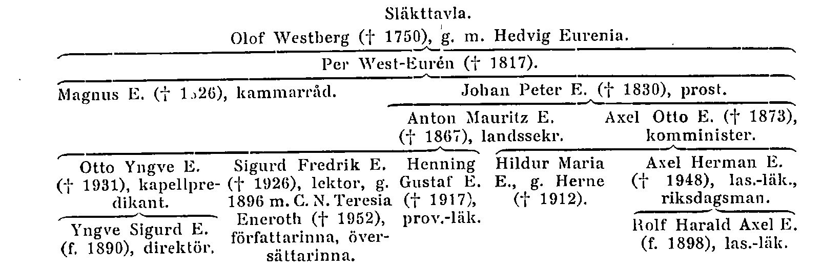 Källor: T. J. Arne, Svenskarna och österlandet (1952); L. Bygden, Hernösands stifts herdaminne, 2–4 (1923–2S); E. Kölgren, Läroverksmatrikel 1908–1900 (1909); A. Lindman, Axel Eurén. In memoriam (Mäster Gudmunds gilles årsbok 194S); N. S. Lundström, Svenska kvinnor i offentlig verksamhet (1924); H. T. O. Ohlsson, Biografisk matrikel över Svenska kyrkans prästerskap 1914 (1914) och 1934 (1934); Svenska släktkalendern, 12, 193S, utg. av G. Elgenstierna, s. 254; Svenskar i utlandet, utg. av I. Högbom (1929); Sveriges läkarehistoria, F. 3 (1901), F. 4 (1930); O. F. Ulff, Biografiska anteckningar om juris kandidater... 1839–1881 (1883); [V. Örnberg], Svenska ättartal, 10, 1894, s. 193.