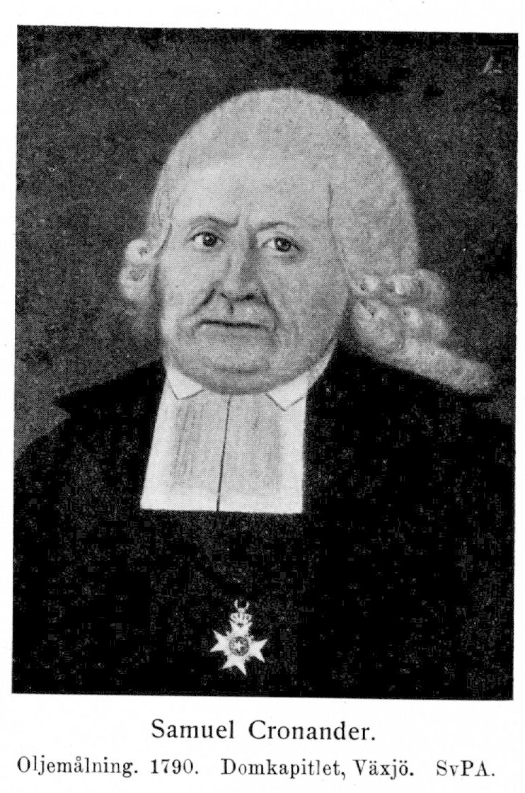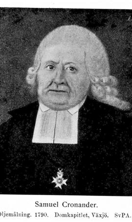 Cronander, Samuel, f. nov. 1719 (i Aringsås?, Skatelöv?), d. 10 apr. 1801 i Växjö. Föräldrar: bonden Arvid Jönsson ocb Märta Persdotter. Elev vid Växjö skola 10 dec. 1730 och vid Växjö gymnasium 1738; student i Lund 27 sept. 1742; disp. 8 apr. 1747 (Dissertatio juris ecclesiastici de legitima ministrorum ecclesiae vocatione; pres. D. Nehrman) och 5 maj 1748 (Dissertatio gradualis de jure nondum natorum; pres. J. Nelander); fil. magister 21 juni 1748. Amanuens vid Lunds universitetsbibliotek 9 apr. 1748; docent i fil. fakulteten 27 dec. 1748; talade på svensk vers å universitetets vägnar juli 1750 till firande av prins Fredrik Adolfs födelse och i nov. 1751 vid högtidlighållandet av Adolf Fredriks och Lovisa Ulrikas kröning; adjunkt i fil. fakulteten vid Lunds universitet 26 juni 1753; förordnad att förestå de teologiska stipendiaternas övningar 1757 och 1759; adjunkt i jur. fakulteten 24 jan. 1758; uppfördes på andra förslagsrummet till professor i ekonomien vid Lunds universitet 24 sept. 1758; tf. professor under professor J. H. Burmeisters frånvaro; v. borgmästare i Lund 1760; uppfördes på andra förslagsrummet till borgmästare i Lund 21 apr. 1761, på tredje förslagsrummet till akademisekreterare vid Lunds universitet genom K. brev 3 mars 1763 och på andra förslagsrummet till justitieborgmästare i Malmö 22 juli 1767; lektor vid Växjö gymnasium 21 nov. 1770 i ämnet grekiska enligt domkapitlets beslut 23 nov. 1770 (upphävt av K. M:t 11 apr. 1771); uppfördes på tredje förslagsrummet till professor i latinsk vältalighet och poesi vid Lunds universitet 13 mars 1771; eloquentiae et poeseos lector vid Växjö gymnasium 23 apr. 1771; erhöll av riksens ständers justitiedeputation löfte om prebendepastorat 6 juli 1772; avlade prästexamen 8 febr. 1772; prästvigd i Växjö 25 febr. 1772; talade på riddarhussalen i Stockholm 4 juni 1772 med anledning av Gustav III:s och Sofia Magdalenas kröning; sökte Tolgs pastorat 1772; andre teol. lektor vid Växjö gymnasium 1773 samt kyrkoherde i Öjaby och Härlövs församlingars pastorat 25 okt. 1773; uppförd på andra förslagsrummet till domprost i Växjö 17 juli 1774; förste teol. lektor 26 aug. 1775 men bibehöll efter enskild överenskommelse sitt gamla prebendepastorat; kontraktsprost i Norrvidinge kontrakt 1776; preses vid prästmötet 13—14 okt. 1778; kontraktsprost i Allbo kontrakt 1779; erhöll domkapitlets uppdrag att utarbeta ny psalmbok 1779; sökte Skatelövs pastorat 1779; uppförd på andra förslagsrummet till biskop i Växjö 5 sept. 1787; domprost därstädes med Nöbbele och Torsås församlingars pastorat som prebende 28 apr. 1789; kontraktsprost i Kinnevalds kontrakt 1789; uppförd på andra förslagsrummet till biskop i Växjö 27 aug. 1800. Jur. doktor vid jubelfesten i Lund 27 juni 1768; teol. doktor vid jubelfesten i Uppsala 6 juni 1793; LNO 1800.