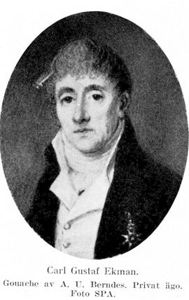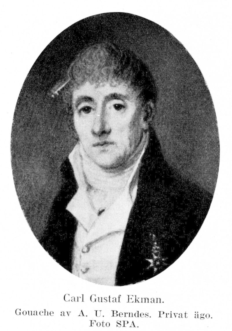 1. Carl Gustaf Ekman, f. 25 dec. 1738 i Nyköping, d. 22 okt. 1819 i Stockholm (Nik.). Föräldrar: landskamreraren Olof Ekman och Beata Elisabeth Westerling. Landskontorsskrivare i Nyköping 1755; e. o. kammarskrivare 12 april 1759 och ordinarie 1761; kammarförvant 31 okt. 1766 (lön som sådan 1 mars 1770); kamrerare i riksgäldskontoret i Statskontoret 22 dec. 1773 från 1 jan. 1774 med sin förra lön; kamrerare i Statskontoret med kammarförvants lön 8 juni 1777 (kamrerares lön 1778); statskommissaries titel 1778; räntmästare i Statskontoret 24 febr. 1780–1785; led. av K. riksgäldsdirektionen 1784; k. ombud hos riksgäldsfullmäktige 1789; led. i finansadministrationen 12 okt. 1790; anges vid sin död även som direktör i tullverket. RNO 1800. – Ogift.