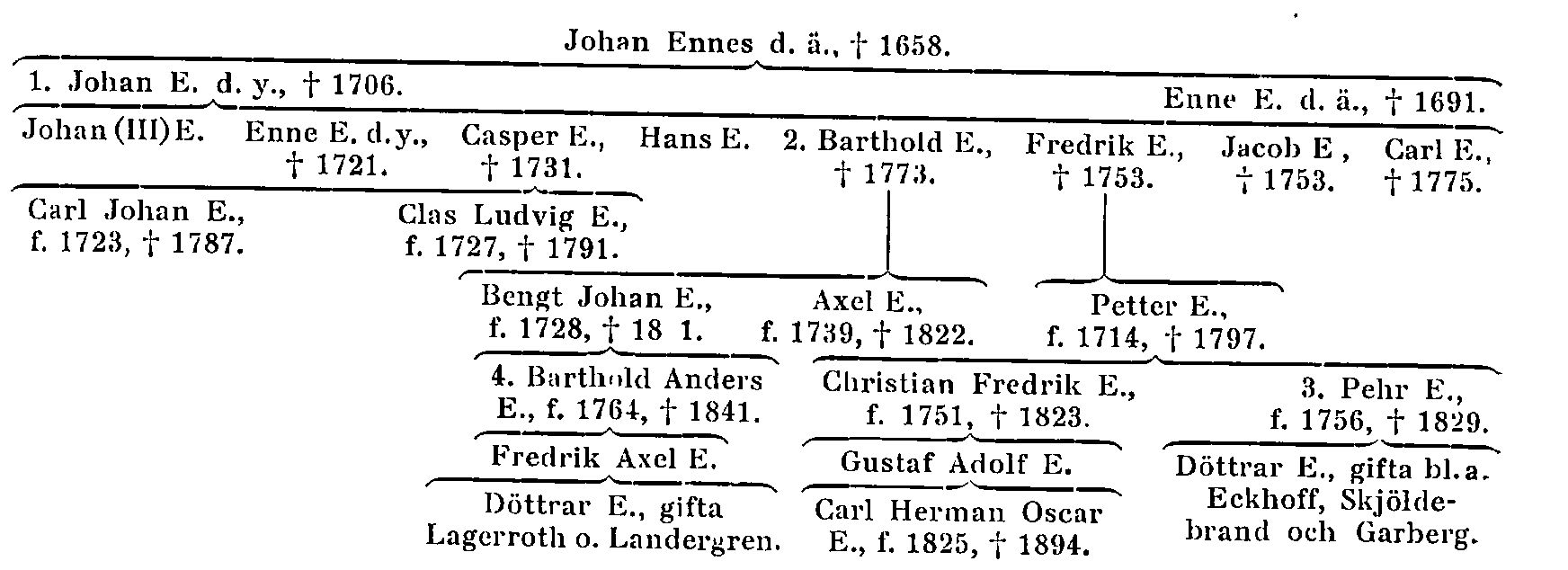 Det blev vinhandlanden och skeppsredaren Johan E. d. y. som kom att fortsätta släkten i det land, som vid tiden för faderns död 1658 blev svenskt. Åtta söner och fyra döttrar till honom äro kända. Den äldste sonen Johan E. (III) valde Danmark och lär ha blivit handlande i Jylland, medan brodern Hans E. (f. 1678) tydligen fortsatt faderns vinhandel i Hälsingborg (levde ännu 1708). Två av bröderna blevo karolinska officerare. Den äldste av dem var Enne E. d. y. (f. 1674, d. 1721), som var löjtnant vid Fortifikationen, men blev fången redan 1704 vid Narva och fördes till Moskva och sedan till Vologda, där han ingick ryskt gifte och dog barnlös. Den andre karolinen är den mera bekante ryttmästaren Barthold E. (E. 2), fången vid Perevolotjna men återkommen till Sverige 1722 och stamfar för Skånegrenen E. Av hans barn utmärkte sig sonen majoren vid G. von Stedingks värvade reg. Axel E. (f. 1739, d. 1822) i andra slaget vid Svensksund 1790; på grund av sitt deltagande där blev han innehavare av Svensksundsmedaljen. Dennes bror majoren Bengt Johan E. (f. 1728, d. 1811) var fader till majoren och godsägaren Barthold Anders E. (E. 4) på Näsbyholm i Fryele sn (Jönk.), fornforskare och militärhistoriker. Hela denna släktgren utdog på manssidan med en son till B. A. E. år 1878. Genom en B. A. E:s sondotter ärvdes vissa av släktens papper till släkten Landergren; en hennes syster blev mor till statsvetenskapsmannen professor F. Lagerroth.
