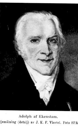 Adolph Ekman, som han hette ännu 1769, eller Ekenman, som var hans mannaålders namn (troligen från 1772), fick som många andra svenska sjöofficerare på 1700-talet en dubbel utbildning, nämligen dels som kofferdist i Ostindiska kompaniets tjänst, dels inom såväl örlogs- som galärflottan. Kompanifärderna till Kanton i Kina, av vilka den åren 1769–71 var på skeppet Finland tillsammans med C. G. Ekeberg (se denne) och J. Wallenberg – skildrad av den senare i »Min son på galejan» — gåvo E. en vidsträckt världskännedom. Vid statsvälvningen 1772 hade E. befälet över två beväpnade slupar, som med hemlig instruktion utsändes i Mälaren. E. deltog 1782 dels i en rekognosceringsfärd mot Norge på linjeskeppet Hedvig Elisabeth Charlotta, dels som sekond på fregatten Illerim, som till spanska farvatten skulle konvojera ett antal svenska handelsfartyg till skydd emot engelsmännens hänsynslösa ingrepp mot den neutrala handeln; då chefen större delen av resan var sjuk, fick E. mest föra befälet. Efter hemkomsten tjänstgjorde E. i Karlskrona till våren 1788. Vid krigsutbrottet och stora flottans utlöpande under hertig Karls överbefäl var E, då kapten, placerad som sekond under överstelöjtnanten H. af Cristiernin på linjeskeppet Kronprins Gustaf Adolph om 62 kanoner och bevistade slaget vid Högland 17 juli s. å. E. var en av dem, som erövrade det enda under bataljen tagna ryska linjeskeppet Vladislav, var den förste av de svenska officerarna, som besteg detsamma, tog befälet där och införde följande dag det sönderskjutna fartyget till Sveaborg. Belöningen blev tre dagar senare E:s majorsfullmakt, varjämte han blev chef på fregatten Fröja om 40 kanoner. Med denna och fregatten Minerva beordrades han att avgå till Porkkalaudd till skärgårdens försvar och för att betäcka flottans och lantarméns proviantering inomskärs. E. lyckades få fram förråden och hindra ett ryskt landstigningsförsök. I nov. s. å. förenades åter båda fregatterna med örlogsflottan vid Sveaborg och avgingo samma månad till Karlskrona. När flottan 1789 åter gick ut, blev E. chef på linjeskeppet Ömheten samt deltog i aktionen mot ryska flottan vid Ölands södra udde 26 juli s. å. E. befann sig ej långt från amiralsskeppet och berömdes av hertig Karl i rapporten till konungen. E. återgick först till Karlskrona,, sedan till Porkkalaudd, där svenskarna misslyckades att tvinga bort de ryska linjeskeppen och fregatterna. Under 1790 års kampanj var E. chef på linjeskeppet Prins Friedrich Adolph, som med den övriga flottan under hertig Karls befäl utlöpte från Karlskrona 30 april. E. bevistade nu attacken mot ryska flottan vid Reval 13 maj, ävensom affärer nära Kronstadt 3 och 4 juni samt 3 juli Viborgska gatloppet, varvid E. var i elden från åttatiden på morgonen till tiotiden på kvällen, enär Prins Friedrich Adolph hörde till de sista skeppen under.återtåget. Han befordrades ånyo, nu till överstelöjtnant. Efter fredsslutet återgick flottan från Helsingfors till Karlskrona. Utnämnd till överste.av förmyndarregeringen 1793 fick E. våren 1794 befälet på linjeskeppet Försigtigheten och deltog därmed i det jämte danskarna anordnade väpnade neutralitetsförsvaret. Året därpå måste E. emellertid på grund av gikt avböja befäl som divisionschef, och sjukdomen förde till hans avsked 1797. E. slog sig nu ned på den nära Mjölby belägna familjegården Sålla (jfr släktart.) i Östergötland, där en talrik barnskara uppväxte. Sedan hans tidigare överbefälhavare hertig Karl såsom Karl XIII bestigit tronen, ihågkom han sin forne medhjälpare och förlänade honom adelskap 1810, då han utbytte sitt namn Ekenman mot af E. Genom dottern Ebbas giftermål 1826 med en så ryktbar person som skalden Atterbom, vilken 1806 varit informator i familjen och alltsedan var familjevän, blev det patriarkaliska hemmet på Sålla allmänt uppmärksammat och har på olika ställen berörts av bl. a. mågen och Malla Montgomery-Silfverstolpe; brev från Atterbom (dock ej till E.) finnas i Höstrumsarkivet, vol. 2 och 33. Även med C. J. L. Almquist, Geijer och A. F. Lindblad hade kretsen av barn från Sålla beröring. Efter E:s svärfader överstelöjtnant Carl Götherhielms död 1789 övertog E. även dennes gård Uljeberg, som dock snart såldes, troligen 1793. E. och hustrun voro båda uppriktigt kristna. En syster till E. var herrnhutiskt orienterad, och sedan av Ers tretton uppvuxna barn dottern Catharina Juliana Ekenstam (f. 1782, d. 1854, g. 1805 m. brukspatron Lars Gustaf Lefrén, f. 1778, d. 1825) och sonen F. Wilhelm af Ekenstam (se vidare släktart.) 1799 nåtts av den herrnhutiska väckelsen på ett rentav svärmiskt sätt, fick hemmet ännu starkare religiös prägel. Detta är bakgrunden till det idealistiska nykterhetsarbete, som tre av E:s söner (se släktart.) särskilt lade sig vinn om. Samma herrnhutiskt betonade anda märkes i Ebba Ekenstams fästmöbrev till Atterbom. E:s maka hade en tyngre, mer prosaisk natur än han, men den upplivades av makens glada sinnesläggning, medan hustruns klokhet och praktiska förstånd voro en ovärderlig hjälp för sammanhållande av det stora hemmet. E. ligger begraven på Sjögestads kyrkogård.