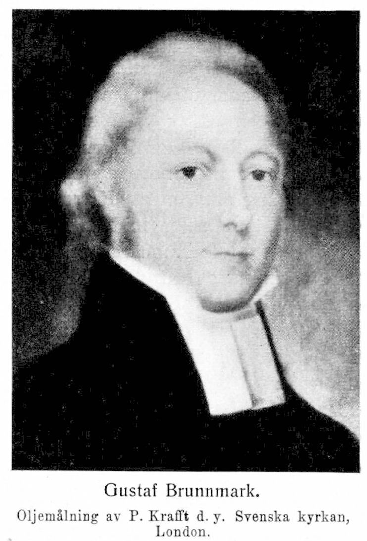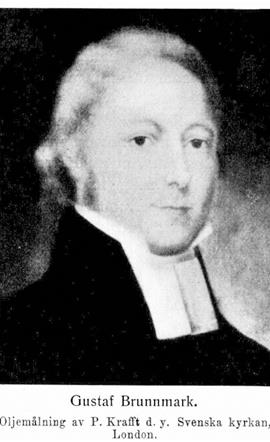 Brunnmark, Gustaf, f. 23 aug. 1773 i Falun, d. 1 aug, 1814 i Husby. Föräldrar: prosten, doktor Petrus Brunnmark och Sara Brita Svedelius. Student i Uppsala 14 juni 1787; disp. 15 juni 1791 (Lineamenta juris publici romano-germanici, Cont. IV; pres. P. H. Liljensparre); fil. kand. 12 dec. 1793; disp. 14 maj 1794 (De limitibus imperii divini; pres. P. N. Christiernin); fil. magister 16 juni 1794. Lärare vid tyska skolan i Norrköping 1794; vistades 1795–96 i England och studerade därunder i Oxford; meddelade privat undervisning i engelska språket åt studenter i Uppsala; prästvigd 16 aug. 1799 på kallelse av brukspatron Alexander Seton på Ekolsund; medhjälpare åt sin svåger, svenske legationspredikanten i London Sam. Conradi Nisser; återvände 1801 och återtog sin undervisning i Uppsala; avlade pastoralexamen inför Västerås domkapitel; legationspredikant och svensk pastor i London 5 juni 1802; kyrkoherde i Munktorp 6 juli 1814. Ledamot av Brittiska bibelsällskapet 1804 och av ett flertal välgörenhetssamfund; erhöll 7 jan. 1808 i kyrkorådets och församlingens närvaro genom svenske ministern i London försäkran om konungens synnerliga välbehag med hans verksamhet; teol. doktor 29 juni 1809 (promoverad 7 okt. s. å.); ledamot av Evangeliska sällskapet 4 sept. 1810.