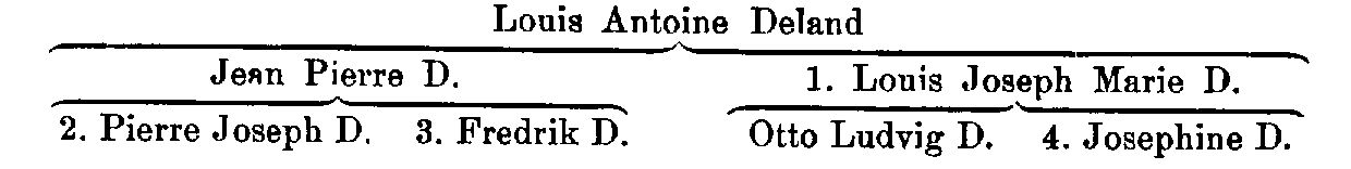 Deland, släkt av fransk härstamning, vilken inkom från Luxemburg till Sverige med frisören och kammartjänaren hos drottning Sofia Magdalena Louis Antoine D. Det är förmodligen denne Deland, som omnämnes i G. J. Ehrensvärds dagbok 3 jan. 1779 i samband med ett avslöjat smugglingsförsök. Av hans söner var A) violinisten vid K. hovkapellet, kammarmusikus Jean Pierre D. (f. 1763, d. 1818) fader till a) skådespelaren Pierre-Joseph D. (se nedan 2), gift med skådespelerskan Hedvig; Lovisa Charlotta de Broen (se nedan under 2) — vilkas dotter Hedvig Christina Elisabeth (Betty) D. (se Almlöfr 4) blev gift med skådespelaren Knut Almlöf — samt till b) skåde-spelaren Fredrik D. (se nedan 3). Yngre son till kammartjänaren. Louis Antoine D. var B) skådespelaren Louis Joseph Marie D. (se nedan 1), vilken var gift först med Ottiliana Carolina: Kuhlman (se nedan under 1), senare omgift Åbergsson, och därefter med Maria Rebecka Rydberg (se nedan under 1). En son till honom i första giftet var skådespelaren Otto Ludvig; D. (f. 21 aug. 1800, d. 31 dec. 1856). Denne var först volontär vid. Livreg:s dragoner men tog avsked därifrån 1821, debuterade vid G, Fr. Åbergssons sällskap under dess sejour i Göteborg på hösten. 1821 och tillvann sig därvid ett visst erkännande. Sedermera överflyttade han sin verksamhet till Stockholm och debuterade å K. teatern 17 dec. 1821. Då han emellertid ej blev anställd vid denna scen, övergick han till Djurgårdsteatern, där han stannade ett par år framåt. År 1824 vann han det förut förgäves sökta engagemanget vid den kungliga scenen, där han sedermera kvarstod till 1846. Han. blev aldrig någon skådespelare i första planet men fyllde väl sina uppgifter, bland annat i det komiska facket. Ivrig jägare och fiskare som han var, utgjorde friluftslivet hans stora passion. Halvsyster till honom var lärarinnan Josephine D. (se nedan 4).