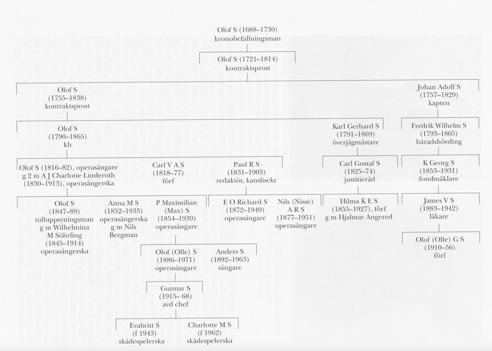 I Olof S:s första äktenskap föddes sonen Olof S (1847–89). Han hade en vacker sångröst men gjorde ingen artistkarriär utan arbetade som tulluppsyningsman. Hans hustru var operasångerskan Wilhelmina Maria S, f Söhrling, (1845–1914). Wilhelmina S studerade vid konservatoriet i Sthlm 1862–65 för bl a Julius Günther. Senare undervisades hon av Isak Berg och Fredrika Stenhammar (ovan s 314) och debuterade 1867 som Jeannette i Joconde (Isourd) vid K teatern. Från 1868 var hon engagerad där och framträdde främst som subrett och i opera-comiquen. En del av rollerna övertog hon av sin makes styvmor Charlotte S. Till hennes mest uppskattade roller hörde Cherubin i Figaros bröllop, Anna i Friskytten och Diane i Kronjuvelerna (Auber). Senare i karriären fick hon ägna sig åt gumroller som Marcellina i Figaros bröllop och Martha i Faust. Efter 35 år vid K teatern tog hon avsked 1903 i rollen som Markisinnan i Regementets dotter (Donizetti). S erhöll Litt et art 1892 och blev associée vid MA.