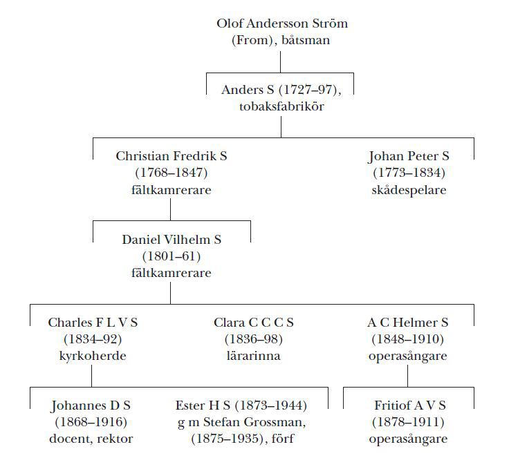 S:s son Fritiof Anders Vilhelm S (1878–1911) bedrev studier vid Musikkonservatorium i Sthlm och var från 1903 engagerad som barytonsångare vid Kungl. teatern, frånsett perioden 1906–08 då han sjöng operett vid Oscarsteatern. Där vann han en första större framgång genom sin insats i en uppsättning av Hoffmans äventyr. På Operan deltog Fritiof S i flera svenska premiärer, bl a av Madame Butterfly, och kreerade 1910 titelrollen vid uruppförandet av Wilhelm Peterson-Bergers Arnljot. Han hölls för att vara en av Kungl. teaterns mest lovande barytonsångare strax efter sekelskiftet 1900, särskilt uppburen för den dramatiska intensitet som utmärkte hans framställningar. Vid uppförandet av dödsscenen i Arnljot råkade S falla mot en järnslå i kulissen varvid han ådrog sig en skallskada som ledde till hans bortgång, blott 33 år gammal.