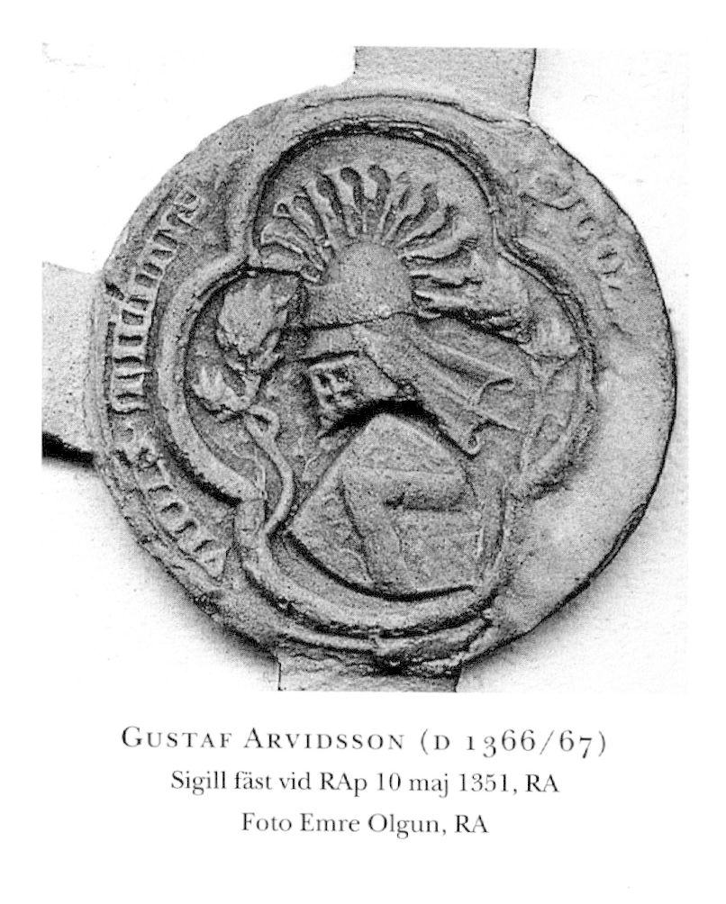 Sonen Gustaf Arvidsson (Arnvidsson; d 1366 eller 1367) förekommer från 1334 (DS 4, s 390: noten), blev riddare vid kung Magnus' kröning 21 juli 1336, riksråd senast 1350 och lagman i Södermanland något av åren 1350-55. Han tillhörde kung Magnus' son Eriks anhängare och senare kung Albrekts. 1334 hade G givit det förutnämnda Vik som morgongåva till sin hustru Cristina, dotter till riksrådet Peter Rangvaldsson (tre ginbalksvis kopplade snedrutor) och änka efter marsken Erengisle Näskonungsson (delad sköld; bd 14). Utom i Uppland innehade han jord i Västmanland och Östergötland.