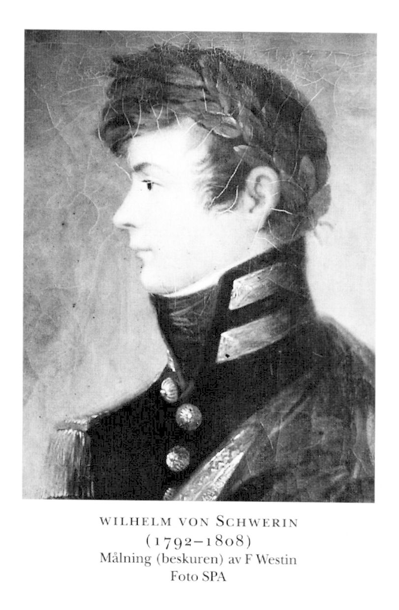 En son till S 1 var den som blott 15-åring stupade Wilhelm Johan Ludvig v S (1792–1808), som genom Runebergs dikt Wilhelm von Schwerin (i Fänrik Ståls sägner) har blivit en litterär gestalt. Han antogs till kadett vid Karlberg 1806, utexaminerades 1808 och åtföljde som underlöjtnant Svea artilleriregemente till Finland. Redan i sin första strid utmärkte han sig, då han på en förpost vid Ömossa 6 sept s å förde befäl över två sexpundiga kanoner och ett fåtal artillerister och under en lång stund lyckades hejda framryckningen av en överlägsen rysk styrka. Han blev flera gånger sårad under "Oravais' blodiga dag" 14 sept s å och dog den 27 i samma månad, ej under själva slaget, som Runeberg med diktarens frihet framställt händelsen. Förlaga för huvuddelen av Runebergs dikt är det brev som S skrev till föräldrarna från sjukbädden 17 sept. Om än i detaljer inte helt korrekt har detta av tydlig stolthet präglade brev i huvudsak bedömts överensstämma med andra samtida källors vittnesbörd både om händelseförloppet i stort och om S:s egen insats i striderna (Hornborg).