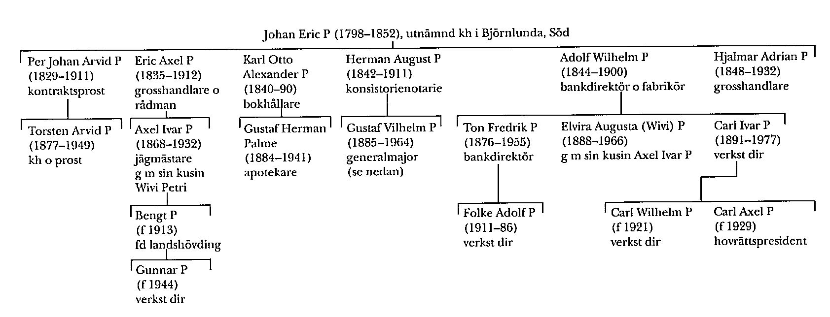 Sonson till Axel P och dotterson till Wilhelm P är fd landshövdingen Bengt P (f 1913). Dennes son är Gunnar P (f 1944), fd generaldirektör och 1988 VD i STIM. Helbror ull Axel, Wilhelm och Hjalmar P var bokhållaren Karl Otto Alexander P (1840–1890) som var far utom äktenskapet till apotekaren, fil lic Gustaf Herman Palme (1884–1941). En femte helbror var Herman August P(1842–1911) som blev FK vid UU 1870, var konsistorienotarie i Linköping 1878-1907 samt ordförande i stadsfullmäktige där 1891. Herman P var far till generalmajoren och krigshistorikern Gustaf Vilhelm P (se nedan).