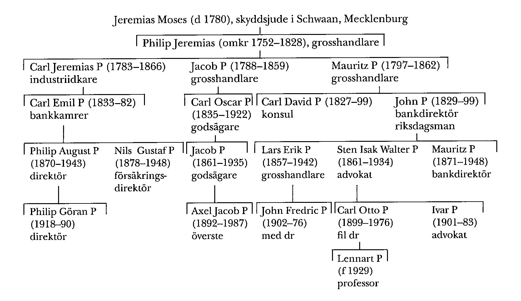 Jacob P var morfar till Alfred Levertin (bd 22). Hans son och sonson övertog Marieborg, sedermera sålt till Norrköpings stad. Sonsonen Jacob P (1861–1935) var framstående inom den sv hästaveln och grundade 1885 ett stuteri, som senare flyttades till det Marieborg närbelägna Loddby i Kvillinge, Ög. Han var far till översten Axel Jacob P (1892–1987) som ledde Artilleriskjutskolan på Skillingaryd 1940–42. Axel P var 1942–46 chef för Bodens artilleriregemente (A 8) – en under andra världskriget viktig befattning – och 1946–52 för Bergslagens artilleriregemente (A 9). Han var den förste mosaiske trosbekännaren som uppnådde regementschefs ställning, och han blev LKrVA 1940. Mauritz P, som blev sv medborgare 1825, fortsatte 1831 den övriga affärsverksamheten under oförändrat namn med handel med spannmål, mjölk, gryn, ull och hudar. Han ägnade sig även åt omfattande förläggarverksamhet, fastighetsaffärer samt bankir- och diskontrörelse, som med tiden torde ha fått allt större betydelse. Bouppteckningen utvisade en mycket stor förmögenhet, 1,6 milj rdr, och han testamenterade medel till bl a mosaiska församlingen och olika välgörenhetsinrättningar i Norrköping. I äktenskap med en dotter till sockerbruksidkaren Isaac David Hirsch i Sthlm (bd 19, s 86) var han morfar till Hugo Geber (bd 16) och far till Carl David P (1827–99) och John P (1829–99), vilka tidigt inträdde i familjefirman.