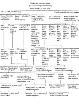 Bland P:s söner var inspektorn i k klädkammaren Petter Pettersson P (1624–80). Dennes son holmmajoren, sedermera amiralen och presidenten Gustaf P (se nedan) adlades med namnet von P 1712 och blev friherre 1719. Hans son Peter v P (1702–76) befordrades i Åbo hovrätt till hovrättsråd 1741, var assessor i Svea hovrätt 1744–47 och ledamot av den av SU 1747 tillsatta kommissionen över Christopher Springer, fick landshövdings titel 1757 och var landshövding i Kronobergs län 1758–63. Med honom utdog denna friherrliga släktgren på manssidan.