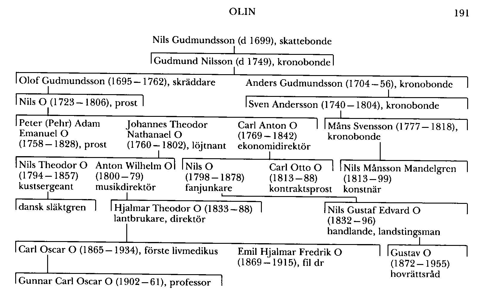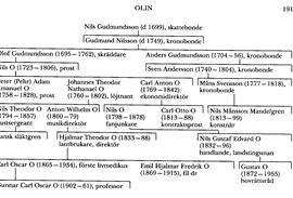 Olin, släkt, härstammande från skattebonden Nils Gudmundsson (d 1699) i Ingelsträde i Väsby, Malm, som var far (Carlsson) till kronobonden där Gudmund Nilsson (d 1749). Av dennes söner Blev kronobonden Anders Gudmundsson (1704–56) i Ingelsträde farfars far till Nils Månsson Mandelgren (bd 25), medan skräddaren Olof Gudmundsson (1695–1762) i Ingelsträde var far till prosten Nils O (1723–1806) i Väsby. Denne efterträddes som kh av sin äldste son, sedermera prosten Peter (Pehr) Adam Emanuel O (1758–1828). Den yngste sonen, gästgivaren och landsfiskalen Carl Anton O (1769–1842) i Fjälkinge, Krist, som 1816 fick ekonomidirektörs titel (Biographica), var far till kontraktsprosten Carl Otto O (1813–88) i Strövelstorp, Krist. Denne Carl O:s brorson handlanden och landstingsmannen Nils Gustaf Edvard O (1832–96) i Lund var far till hovrättsrådet Gustav O (se nedan).