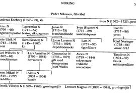Noring, släkt, härstammande från Sven N (1662–1723), vilken i sina självbiografiska anteckningar (X 240) som sina föräldrar uppger fältväbeln Peder Månsson och Christina Svensdotter i Gäsene hd, Nårunga församling och "Ehneby", varmed torde åsyftas Äne i Nårungas annexförsamling Kvinnestad, Älvsb. Denne faltväbel har ej kunnat återfinnas i KrA:s rullor och har identifierats (Kocken) med en kvartermästare Per Månsson, som stupade i slaget vid Lund 1676, efterlämnande en änka vid namn Anna Andersdotter. Denne bodde emellertid enligt rullorna i Rya, Murums sn, Älvsb. Henrik N:s uppgift, att Sven N enligt UUM 1684 skulle ha varit son till en "rusticus" (bonde) i Norgården i Äne, har ej kunnat verifieras vare sig där eller i Västgöta nations matrikel, varför hans slutsatser angående faderns identitet och genealogiska bakgrund saknar stöd i källmaterialet. Enligt hm var Sven N bror till kh Andreas Eneberg (1657–99) i Ekby, Skar.