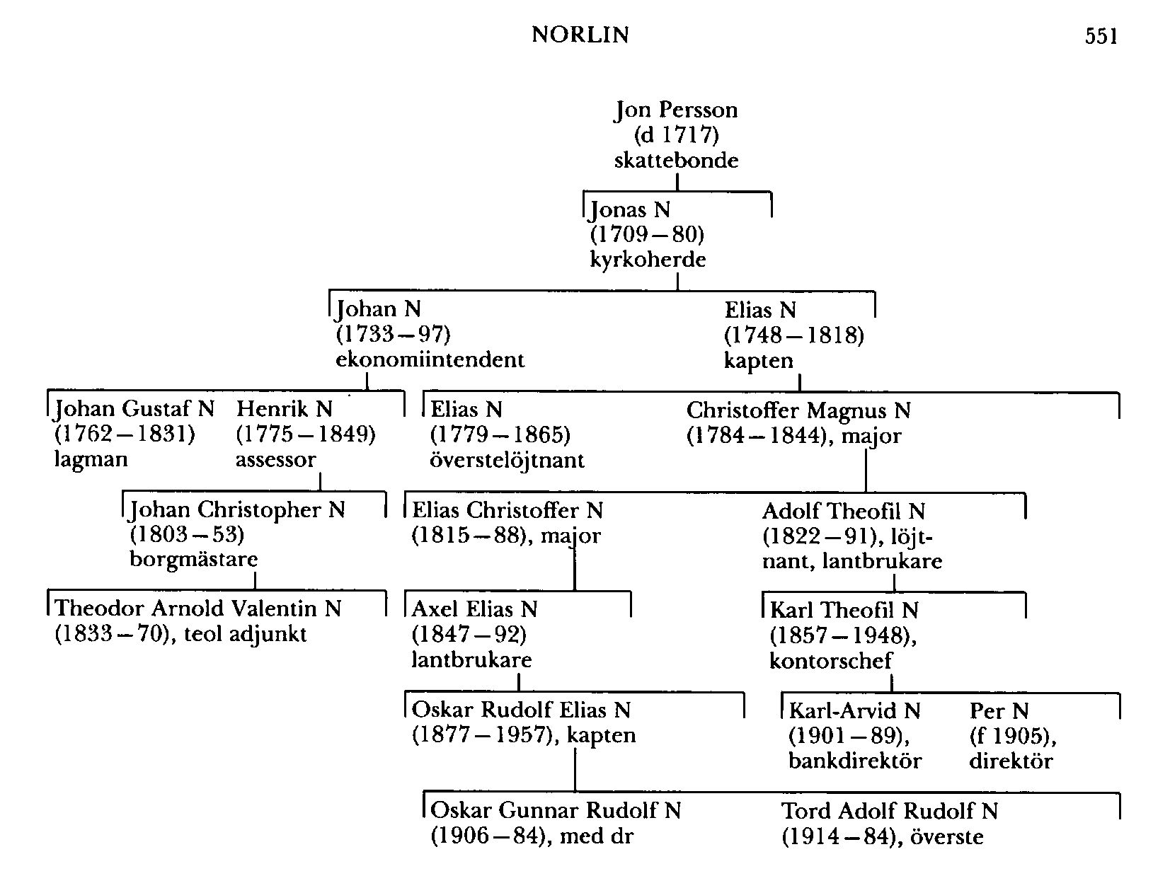 Norlin, släkt härstammande från skattebonden Jon Persson (d 1717) i Skullersta, Nora, Vnl, vars söner antog släktnamnet. En av dem, kh i Västeråker och Dalby, Upps, Jonas N (1702–80), var farfar till Johan Gustaf N (1762–1831). Denne blev 1793 polismästare i Sthlm men ådrog sig G A Reuterholms missnöje och utnämndes därför redan s å till lagman i Ångermanland och Västerbottens lagsaga. Han förflyttades 1795 till Västernorrlands lagsaga, där han tjänstgjorde till 1827.