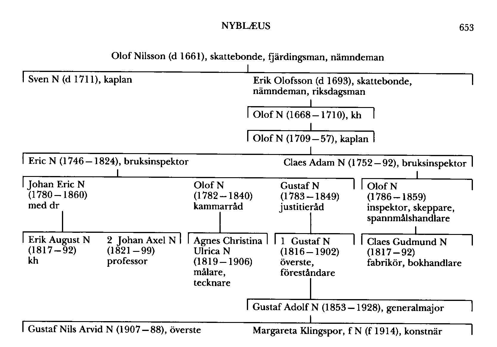 Nyblaeus, släkt, härstammande från skattebonden och fjärdingsmannen Olof Nilsson (d 1661) i (Södra) Nybble, Sköllersta, Ör, som var nämndeman från 1646 eller 1647 och blev far (Sköllersta P I:1) till kaplanen Sven N (d 1711, 81 år gammal) i Sköllersta. Den senare kallas (Sköllersta P I:1) farbror till kh Olof N (1668–1710) i Sköllersta, vilken kallade Sven N "patruus" (farbror) i sina självbiografiska anteckningar (tr Follén, s 510) och var son (Sköllersta C:2, f 13 v) till Erik Olofsson (d 1693, 60 år gammal) i (Södra) Nybble, som var nämndeman åtminstone från 1670 och riksdagsman 1680 och 1682.
