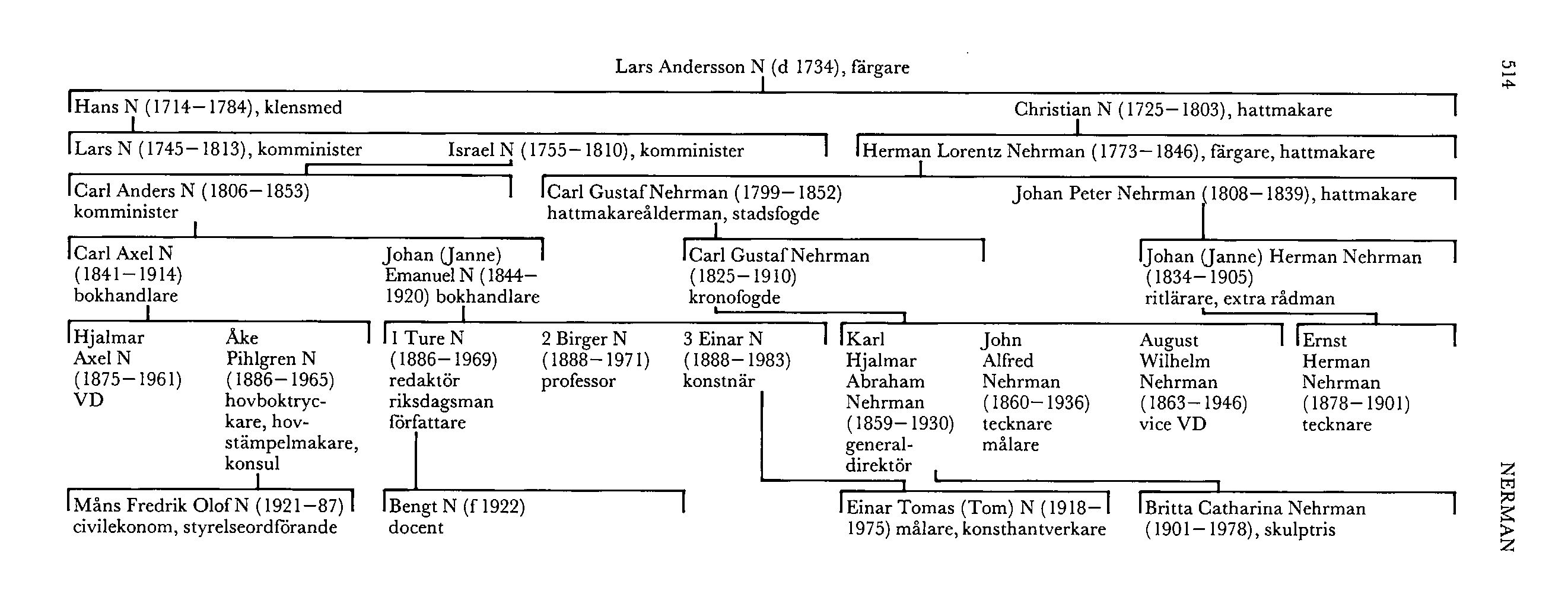 Lars Andersson N:s son hattmakaren Christian N (1725-1803) i Vimmerby var farfars far till Johan (Janne) Herman Nehrman (1834–1905), som genomgick Sv slöjdföreningens söndags- och aftonskola (från 1860 Slöjdskolan i Sthlm) 1859–61, blev extra ritlärare vid Vadstena lägre elementarläroverk 1862, var ordinarie sådan 1895—1903 och blev extra rådman där 1897. Han var även verksam som dekorations- och kyrkomålare. Son till honom var tecknaren Ernst Herman Nehrman (1878–1901) i Vadstena.