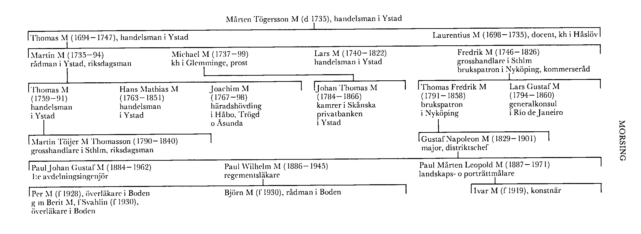 Morsing, släkt, härstammande från handelsmannen i Ystad Mårten Togersson (d 1735, 84 3/4 år gammal), som ännu i notiser i dopboken för S:ta Maria församling i denna stad 1690–1700 saknar släktnamn men kallas M bl a i denna dopbok 1705 liksom i en uppgift från 1830 om en kalkinskription 1712 (Carlquist o Borg). Någon släktskap mellan honom och framstående danska personer med samma släktnamn (se DBL) har ej kunnat beläggas, ehuru en systerson till den danske viceamiralen Peter Jensen M (d 1678) varit handlande i Ystad (Lunds hm, 2:3, s 494); släktnamnet anses tyda på härkomst från ön Mors, i Limfjorden på norra Jylland. Mårten var en av Ystads rikaste män, men en uppgift (Bjurling, s 410), att han skulle ha varit rådman, har ej kunnat verifieras i rådhusrättsprotokollen. En av hans döttrar gifte sig med rådmannen i samma stad Martin Lorich (bd 24, s 116). Sonen Laurentius M (1698–1735) blev magister i Lund 1719 och var docent i matematik där 1722–26 samt blev kh i Håslöv, Malm, 1726 (tilltr 1727). Han var morfar till professor Lars Peter Munthe (s 815).